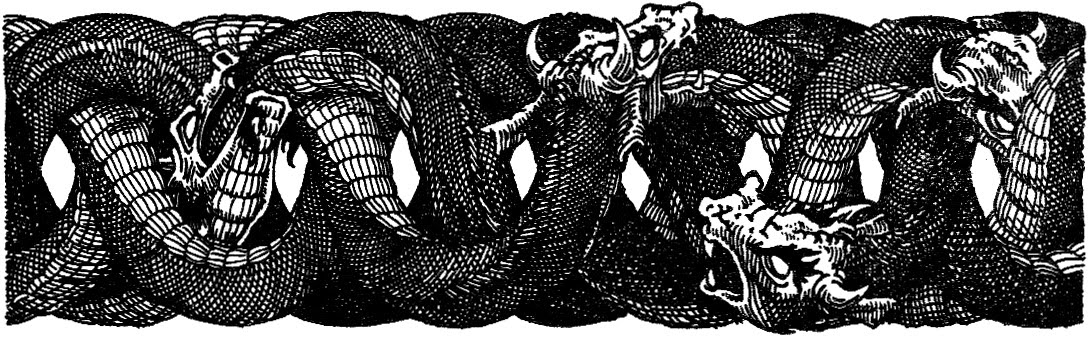 The Keep on the Borderlands seems like the last place to find a rare piece of TSR artwork. Gary Gygax himself wrote the module and included it as an introductory adventure in two different editions of the Basic Dungeons & Dragons boxed set (both the blue Holmes set and the magenta Moldvay set). TSR printed an estimated 1.5 million copies and it ranked the 7th greatest D&D adventure of all time in Dungeon magazine issue #116. Countless players and DMs cut their RPG teeth on this module (myself included). It can hardly be considered "rare."In 1980, one odd illustration appeared only in the second printing of the module where intertwined, horned dragon-serpents devour each other at the bottom of page 5.